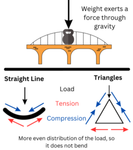 When you add weight to the top of your bridge, the load is transferred through the points of the triangles and down into the supports (the books or boxes). This even distribution of weight helps to keep the bridge stable. If you didn’t use triangles and just built a straight line of marshmallows and toothpicks, the load wouldn’t be evenly distributed, making your bridge much less stable and able to hold less weight.
