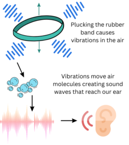 When the rubber bands vibrate, they push and pull on the surrounding air molecules, creating areas of high pressure and low pressure. These pressure changes form sound waves that travel through the air and reach our ears. Our ears detect these sound waves and send signals to our brain, allowing us to hear the music created by the vibrating rubber bands.