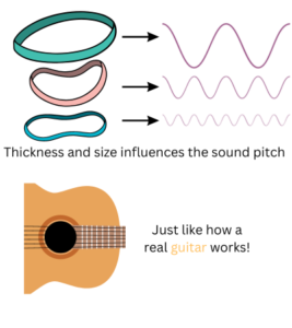 - Pitch: By adjusting the tension and length of the rubber bands, you will observe how it affects the pitch or the highness and lowness of the sound.