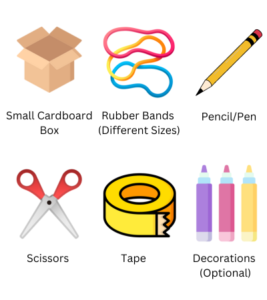 Step 4: Prepare to play! a) Hold the box firmly with one hand. b) Use your other hand to pluck the rubber bands. Gently pull and release them to create vibrations. c) Listen to the sounds produced by the vibrating rubber bands.