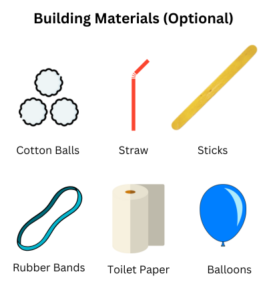 - Assorted materials for building (such as straws, popsicle sticks, cotton balls, rubber bands, tissue paper, balloons, bubble wrap, etc.)